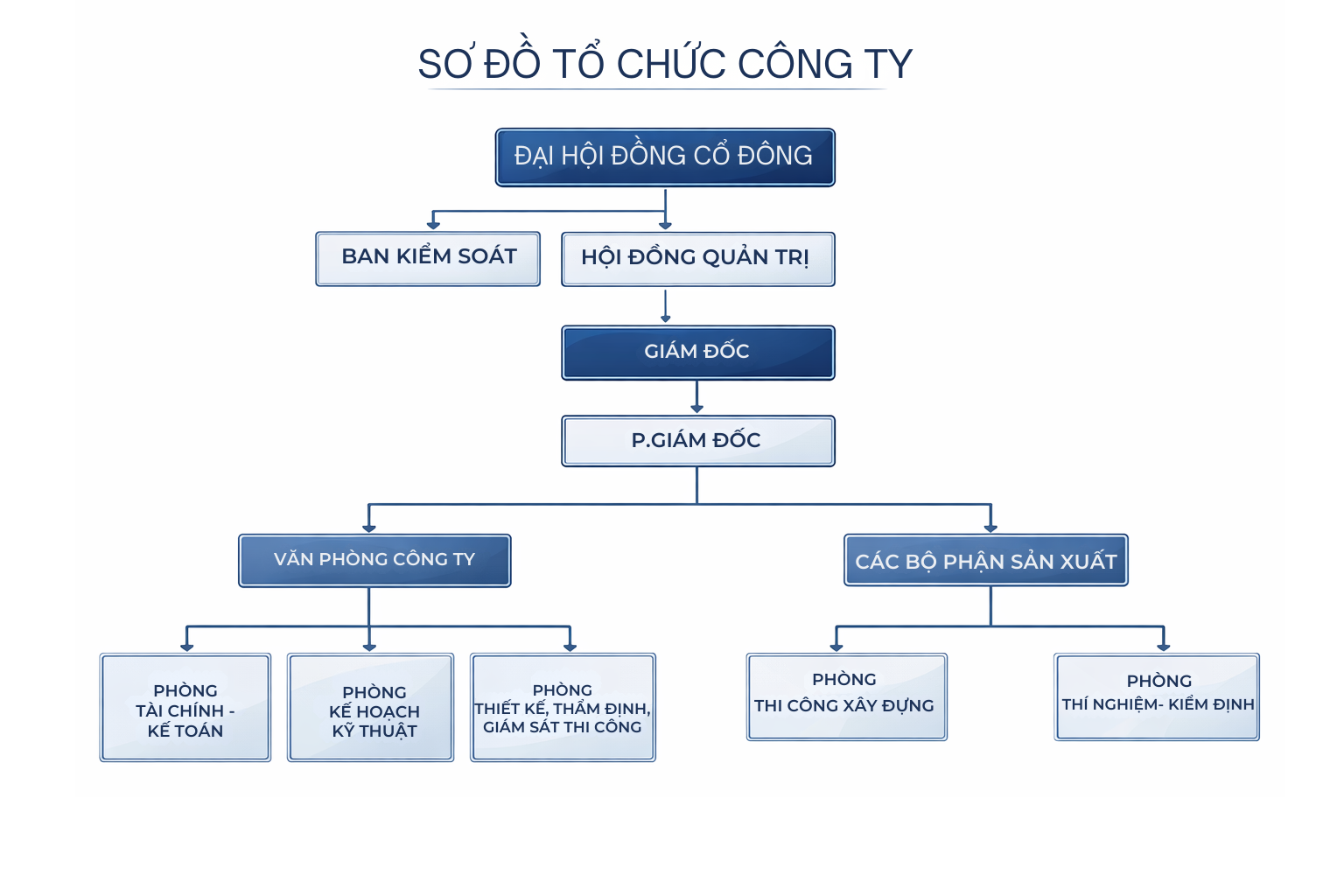 Ban giám đốc – Trưởng các phòng ban 1. Giám đốc: - KS. Hoàng Đức Viện 2. Phòng Tài chính - Kế toán Trưởng phòng: CN. Chu Thị Khánh. 3. Phòng Thi công xây dựng: Trưởng phòng: KS. Văn Tuấn Nghĩa. 4. Phòng thí nghiệm, kiểm định, khảo sát xây dựng Trưởng phòng: KS. Vũ Văn Thành 5. Phòng thiết kế, thẩm định, giám sát thi công Trưởng phòng: KS. Phạm Văn Cương